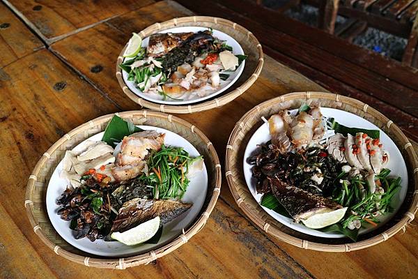焦香山豬肉、鮮嫩油雞、椴木香菇炒水蓮、晴人的眼淚、塔香螺肉、香煎海魚,