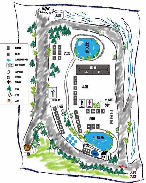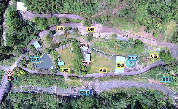 營地裡有戲水池、釣魚池、螢火蟲,可以捉溪蝦,