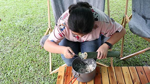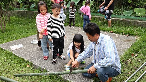 營主會到山上鋸下竹子,在營地裡讓小朋友體驗將竹子一截一截鋸下來。