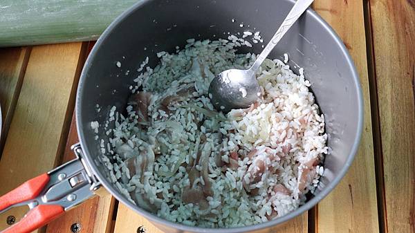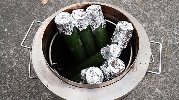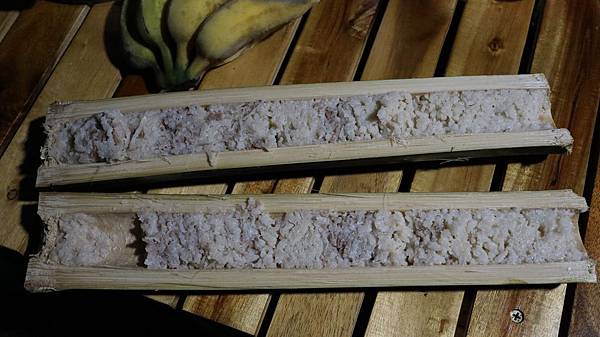 填在竹筒裡的米飯、豬肉、洋蔥、醬料